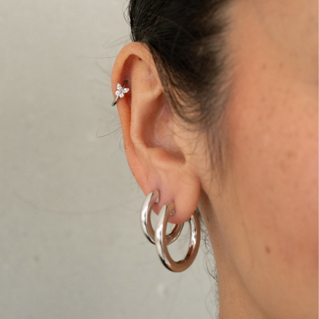 Mit unseren Piercings bringst du deine Earparty auf ein neues Level! Unsere Piercing Hoops sind mit Scharnierverschlüssen versehen, daher kannst du es ganz leicht an- und ablegen und sie reizen dein Ohr nicht. Dieses Piercing eignet sich perfekt für deinen Conch, Helix oder als Ohrring.