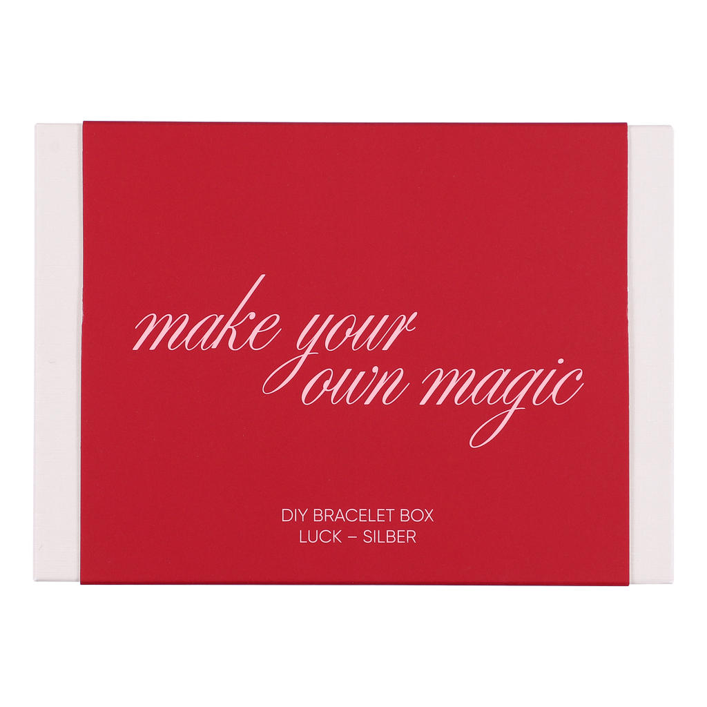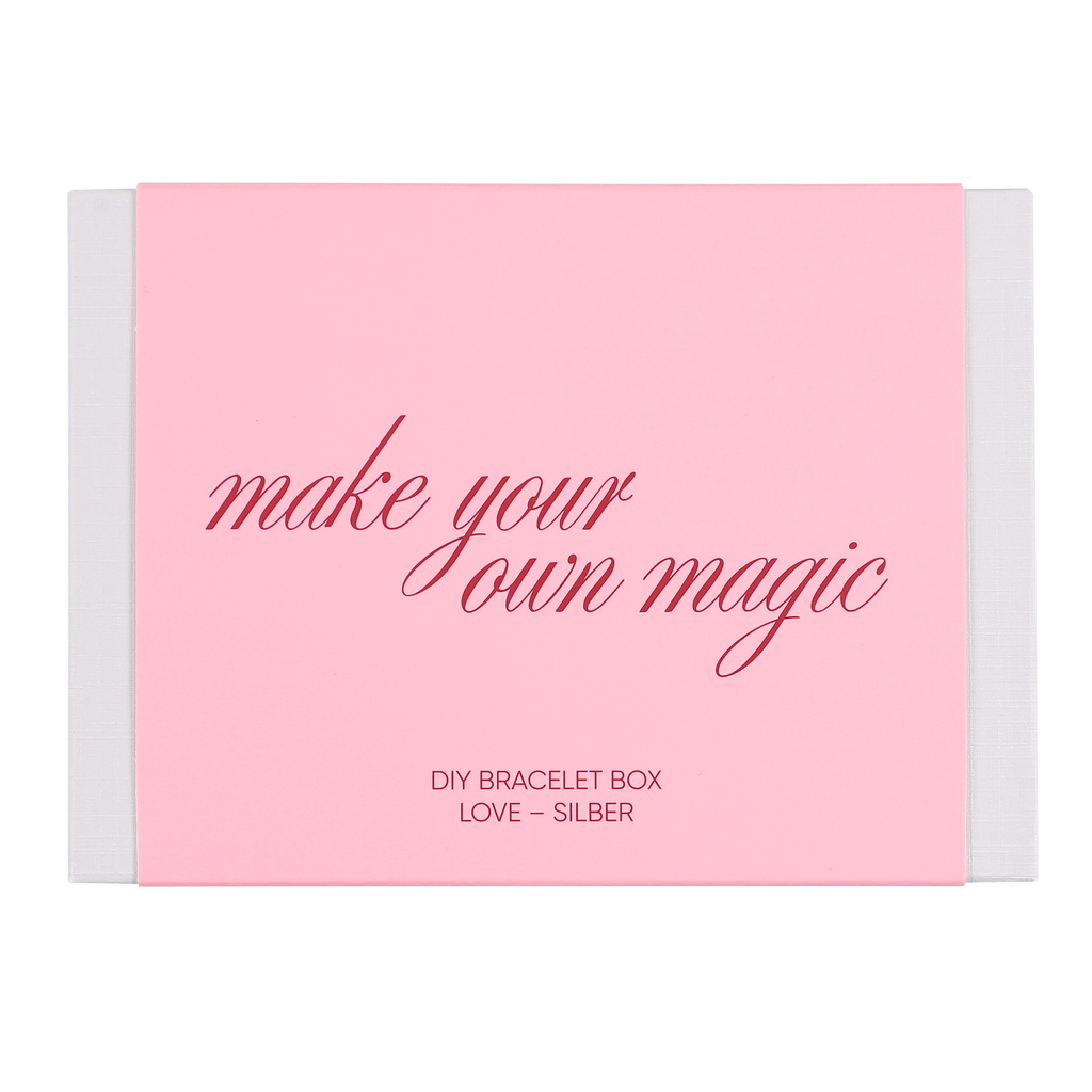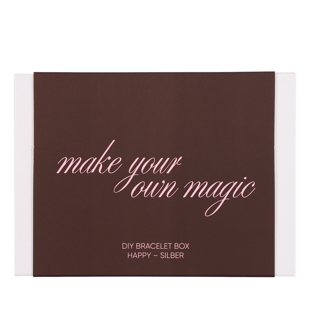Die DIY BRRACELET BOX gibt es in drei verschiedenen Varianten: HAPPY, LOVE und LUCK. In den Boxen ist jeweils ein Set aus 3 hochwertigen Bändern in verschiedenen Farben, fünf verschiedene Charms und ein Lock enthalten. Alle Boxen gibt es in silber und gold.