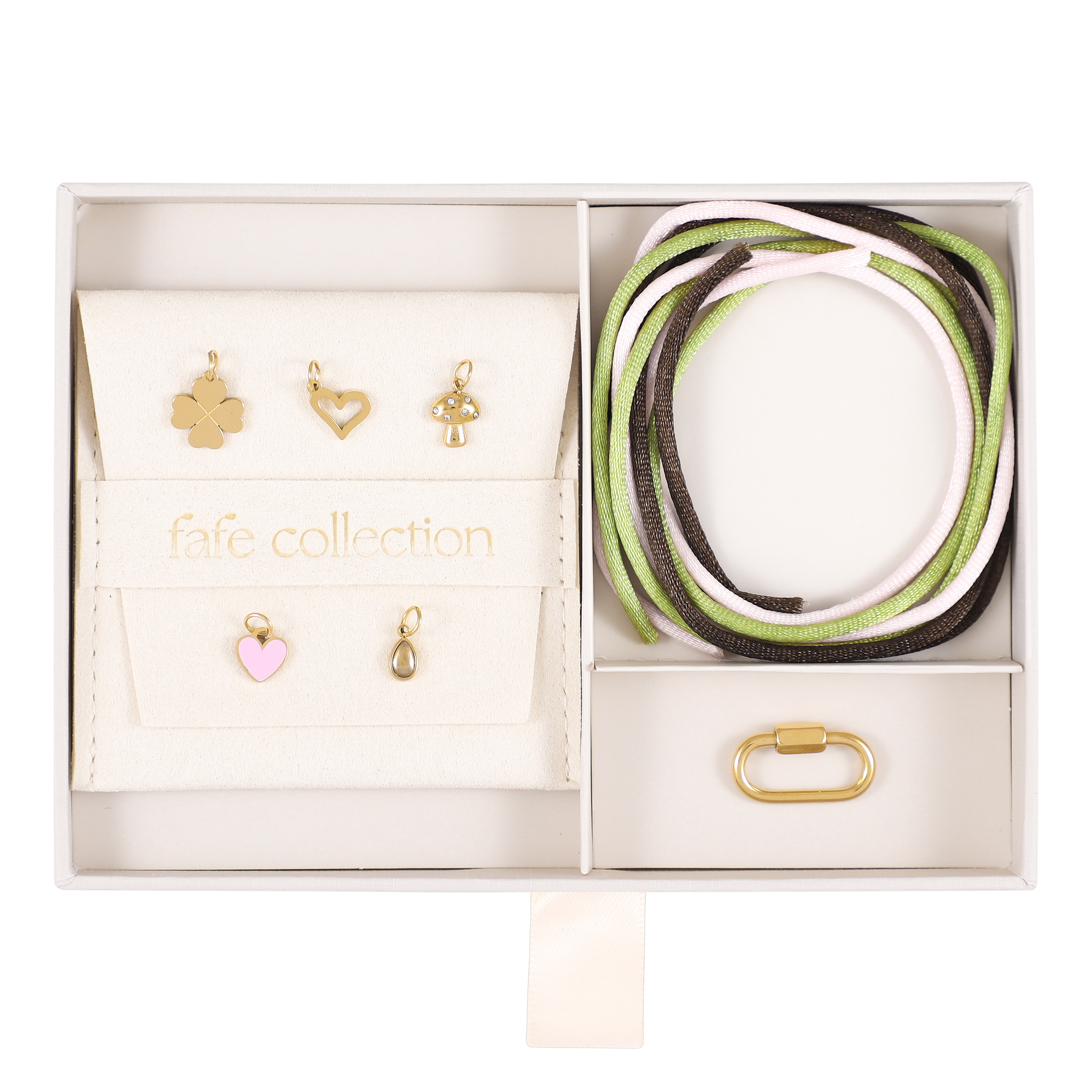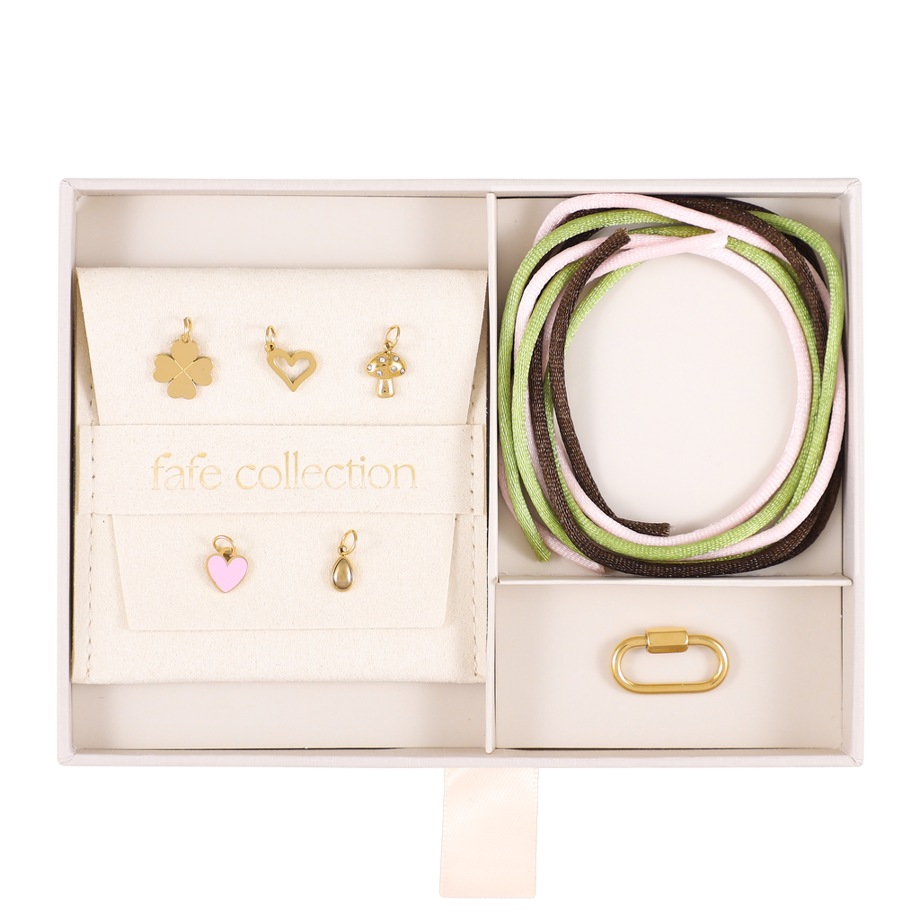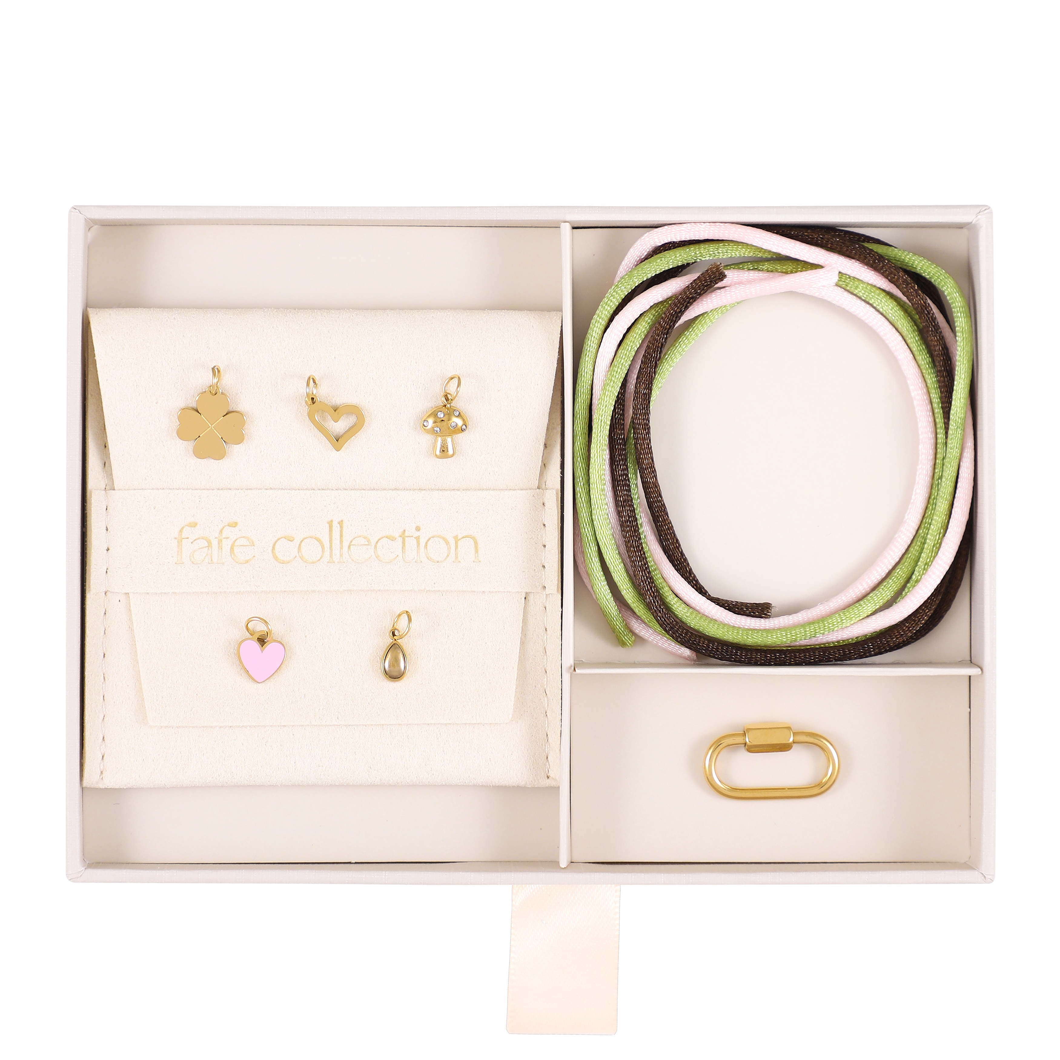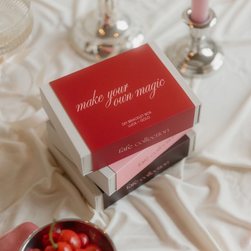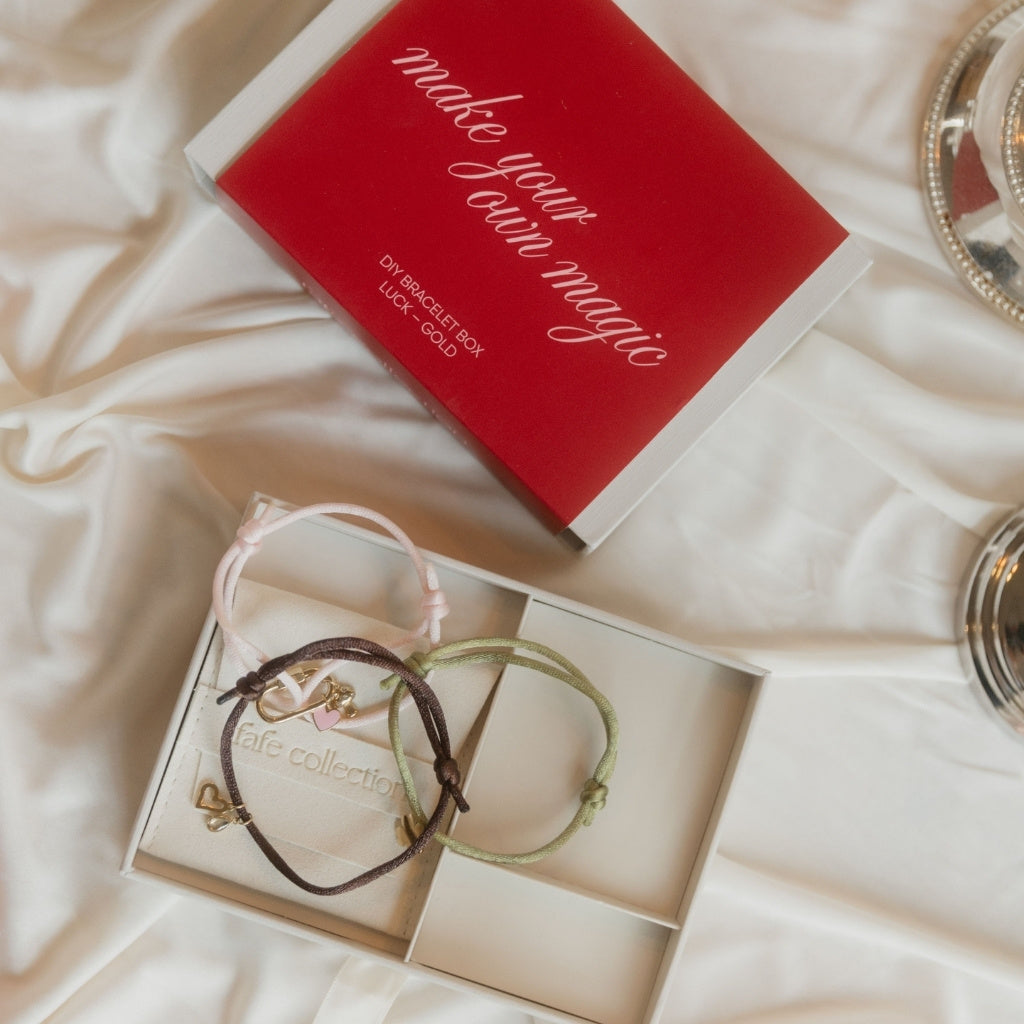 Mit unserer DIY BRACELET BOX - LUCK gestaltest du deinen eigenen, individuellen Armschmuck – ganz nach deinem Stil! Die Box enthält alles, was du für einzigartige Armbänder brauchst: 5 hochwertige Charms, 3 farbige Bänder und einen Lock. Perfekt zum Verschenken oder für gemeinsame kreative Zeit. MAKE YOUR OWN MAGIC!